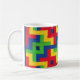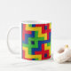 A white coffee mug with a colorful, abstract design from a patchwork cot-quilt by Judy Adamson.