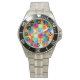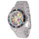 This men's watch has a Bauhaus design of squares with odd shapes inside, repeated across the design.