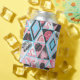 Patchwork-style tropical pattern features flamingos and palm leaves.