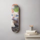 The skateboard has a specific design. In this case, the skateboard design is inspired by a Devon Rex cat. The cat depicted on the skateboard has blue eyes, suggesting that the distinctive characteristic of this feline race has been captured. The mention of "blue eyes" highlights the peculiarity of the cat's gaze in the skateboard design. In short, the skateboard is distinguished by its theme design highlighting the image of a blue-eyed Devon Rex cat.