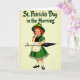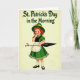 This card features a sweet St. Patrick’s Day illustration of a young girl standing against a creamy, lightly textured off‑white background, giving the scene a soft, nostalgic look 💚. Fiery red curls spill out from under her emerald green hat, which is trimmed with a sunny yellow ribbon, and her rosy cheeks and curious eyes make her feel like she’s sharing a quiet secret with the viewer. She wears a green dress with a dark bodice and a crisp white ruffled apron, finished with a green-and-white checkered edge along the hem. In one hand she carries a closed black umbrella, and in the other she holds a cane with a hook handle, like she’s ready to stroll alongside a close friend on a misty morning ☘️. Her pose is thoughtful, with one finger resting at her chin, adding a gentle, tender note to her expression. The phrase “St. Patrick’s Day in the Morning” appears in dark green lettering on the right side of the design, standing out clearly against the pale background. The hat’s yellow ribbon sits just above her curls, and the umbrella and cane are drawn in deep black with small highlights.