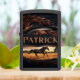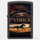 A close-up of a black leather saddle with the name Patrick carved into it. Inside the saddle is a painted scene of a brown horse running in a field.
