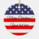 Personalized American flag Christmas tree ornament. Custom X-mas Holiday decorations in round or heart shape. Patriotic Flag of American design. Trendy xmas decor for friends, family, kids, co worker, employee, boss, children, wedding couple, mom and dad, grandparents, relatives, baby etc. Add your own season's greeting and photo on the back optionally. Elegant script typography template. Gold glittery string included. Also nice for 4th of July party. USA pride design. Create your own keepsake for 1st Christmas together or other occasion. Stars and stripes red white and blue.