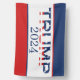 This patriotic Donald Trump 2024 presidential campaign house flag features the name "Trump" printed in an American flag pattern. The stars are printed on the top half and the stripes on the bottom portion. The election year "2024" is printed below in a navy blue font. The top and bottom portions of the flag feature blue and red banners.