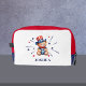 Patriotic personalized dopp kit or toiletry bag with a kid's name. Design with a bear and stars in red, white, and blue colors.