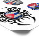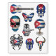 This collection of temporary tattoos by artist Jeff Bartels includes nine patriotic Cuban flag designs. The first design is the flag of Cuba painted on to an old acoustic guitar. The next designs are a Cuban sugar skull and a small butterfly. An adorable baby owl with glasses and a baby penguin playing the guitar are also in the set. A stylized tree of life and tribal pattern are followed by a dark flag skull and bull skull. These patriotic temporary tattoos are a stylish way to show off your Cuban pride.