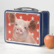 This is a standard metal lunchbox that appears to work just fine. We designed this box ourselves with an uploaded photo and custom text on the front and back. It looks absolutely beautiful except the front of the lunchbox is not centered like it shows in the photo. The print borders don't align with the inset flat part of the box where the preview photo online showed it perfectly centered in there. The back looks nice and centered though.