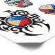 This collection of temporary tattoos by artist Jeff Bartels includes nine patriotic Filipino flag designs. The first design is the flag of The Philippines painted on to an old acoustic guitar. The next designs are a Filipino sugar skull and a small butterfly. An adorable baby owl with glasses and a baby penguin playing the guitar are also in the set. A stylized tree of life and tribal pattern are followed by a dark flag skull and bull skull. These patriotic temporary tattoos are a stylish way to show off your Filipino pride.