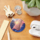 This button style keychain is shown with a image print of a patriotic USA Flag and fireworks.