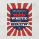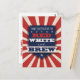 Announce your patriotic party with this bright, eye-catching design. The front of the postcard is comprised of a navy blue shield shape set against a red and creamy-white starburst stripe pattern. Inside the shield are the words "Three cheers for the red white and brew" along with creamy-white stars and a modern ribbon banner. The reverse side has plenty of space for multiple lines of custom text. Use the easy provided templates to personalize the postcard to suit your event. Perfect for summer barbecues, political or election day parties, or July 4th celebrations.