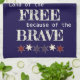 This design features red, white, and blue bunting across the top and stars along the bottom with "Land of the FREE because of the BRAVE" message. Great for patriotic holidays or all summer.
