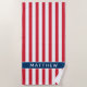 Patriotic Red Stripe Blue Monogram Name Beach Towel