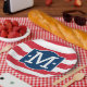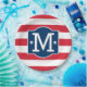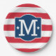 Patriotic paper plate design features a decorative frame with custom monogram initial, star accents, and horizontal stripes. Navy blue, red, and white colors.
