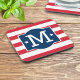A bold patriotic monogram beverage coaster featuring a custom initial framed in navy blue against a classic red and white striped background. The stars and stripes-inspired design makes this perfect for Fourth of July celebrations, military homecomings, or year-round patriotic decor. A thoughtful personalized gift for anyone who loves Americana style. All text is fully customizable.