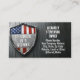 Vintage metal industrial style shield with Patriotic American Flag logo, in red white and blue. Grunge black and silver brushed metal style background. Customize this business card to promote your auto mechanic small business, repair shop, domestic car mobile mechanic business, car dealership, auto parts sales or other automobile related business. Easily add your information for an instant preview. Here are some great uses for this design: auto mechanic,car,mobile,mechanic,automobile,sales,service,truck,veteran,garage,