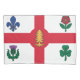 The design showcases the official flag of Montreal, which features a bold red cross dividing a white background into four quadrants. Each quadrant contains a floral emblem representing the city’s founding communities: the blue fleur-de-lis for the French, the red rose for the English, the purple thistle for the Scots, and the green shamrock for the Irish. At the center of the cross is a red maple leaf symbolizing Canadian unity. This iconic flag design reflects Montreal’s diverse roots and enduring spirit.