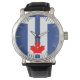 This stylish watch showcases the bold and meaningful design of Toronto’s official flag: a crisp white stylized “T” symbolizing the city’s distinctive skyline and layout, embracing a vibrant red maple leaf that stands as a proud symbol of Canada. The deep blue background, reminiscent of Lake Ontario’s waters, provides a striking contrast that highlights the flag’s clean lines and modern aesthetic.