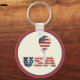 Patriotic keychain design features U-S-A letters with red white and blue stars and stripes fill and a patriotic flag balloon. Perfect for 4th of July celebrations, citizenship ceremonies and other patriotic days.