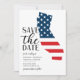 Patriotic California destination wedding save the date with a state illustration and the USA flag.