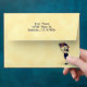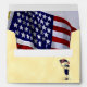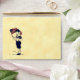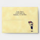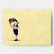 A custom envelope with vintage Americana 4th of July art with a patriotic boy holding red holiday fireworks and an old US flag on a faux parchment background.