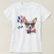 The feature on this unique shirt is a watercolor image of a Corgi dog wearing sunglasses and a flag themed bow tie. Beside the dog image is a stars and stripes paw print with "USA" in navy blue below it.