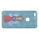 This Google Pixel phone case has a patriotic USA folk art angel holding an American flag dressed in red white and blue on a medium blue background with tiny gold stars.