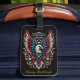 A bald eagle with wings patterned in the colors of the American flag, framed by intricate gold designs.