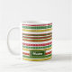 This mug design features a pattern of red, yellow, and green Christmas stripes. These are colors commonly associated with Christmas. It also features a customizable name and year in white-colored text within a dark-colored area.