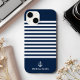 Personalize this cute Navy and White Striped Nautical Print Phone Case with your name on a Navy Blue background. The design features a modern white script typography on a Navy Blue background. The example is for an iPhone 14 model, but it will fit other models on Zazzle. Please verify before purchasing.