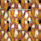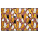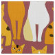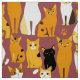 Fabric in a playful pattern of stylized cats in warm shades of ginger, cream, black, and brown on a caramel brown background. Each cat has its own cute expression and markings, with little paw prints scattered throughout.