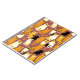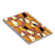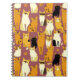 Notebook in a playful pattern of stylized cats in warm shades of ginger, cream, black, and brown on a caramel brown background. Each cat has its own cute expression and markings, with little paw prints scattered throughout.