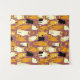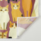 Tapestry in a playful pattern of stylized cats in warm shades of ginger, cream, black, and brown on a caramel brown background. Each cat has its own cute expression and markings, with little paw prints scattered throughout.