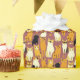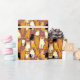 Wrapping paper in a playful pattern of stylized cats in warm shades of ginger, cream, black, and brown on a caramel brown background. Each cat has its own cute expression and markings, with little paw prints scattered throughout.