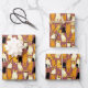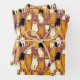 Wrapping paper in a playful pattern of stylized cats in warm shades of ginger, cream, black, and brown on a caramel brown background. Each cat has its own cute expression and markings, with little paw prints scattered throughout.
