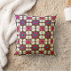 "A decorative throw pillow featuring an intricate and vibrant kaleidoscope-like pattern. It's characterized by a rich blend of deep red, cobalt blue, and fresh green, intermingled with hints of purple and white, forming delicate floral or starburst motifs. This design evokes a lively, culturally rich, and artistic feel, perfect for adding a splash of color and a captivating focal point to a living room, bedroom, or any space desiring a storied and stylish ambiance."