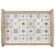 Serving tray with a series of nine (9) different Spanish-style tiles in neutral colored, mosaic pattern.