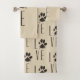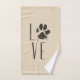 Towel set with a repeating pattern of a cute illustration of a pet's paw print in brown with a grunge style. The letters spell out the word "Love" with the paw print in place of the letter "o". Awesome for pet lovers.