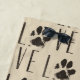 A beach towel with a repeating pattern of a cute illustration of a pet's paw print in brown with a grunge style. The letters spell out the word "Love" with the