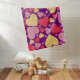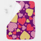 This cute baby blanket features a heart collage. Each heart is filled with a trendy and colorful pattern in red, pink, purple and gold. The background color is dark purple.