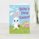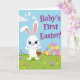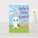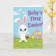 This card shows a white, humanlike long‑eared bunny with big blue eyes and a wide smile, standing in a green field and holding a small woven basket of decorated eggs 🐰. Nearby, a rounded pile of patterned eggs sits to the right, like a shared stash the bunny is eager to show off to a close friend. Small flowers dot the grass, and a few scattered eggs add little moments that feel like they were placed with care for someone special 🌷. The sky is light blue with soft white clouds, and a few white birds glide overhead to keep the scene calm and airy. In the upper right, purple lettering announces a milestone message, set large against the open sky for easy reading. The colors lean toward gentle pastels with fresh greens, giving the bunny a friendly, welcoming presence. The basket’s woven texture is drawn with light tan lines, and the egg designs include stripes, dots, and zigzags in mixed spring colors. In the foreground, tiny blossoms sit among blades of grass beside a couple of eggs resting near the bunny’s feet.