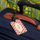 Styled modern peacock feather design patterned graphic luggage tag. Perfect for holidays and trips. Add your name to front of tag and customize the reverse of this tag with your name and address details. Designed exclusively by Sarah Trett.