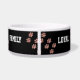 A unique, fun dog food dish for animal lovers who consider pets part of the family. Black background with faux embossed foil, trendy rose gold paw prints. Each section displays a well known quality of man's best friend. From left to right it reads Loyal, Fun, Pal, and Family. The center is reserved for your own dog's name for a personalized dog food bowl. Great gift for either a beloved pet or a dog lover and owner! Feel free to change the doggie traits listed with traits for your own fur baby or a customized message. Visit our Zazzle.com/angela65* shop for more gifts for pets and personalized animal lover gifts.