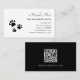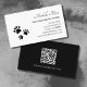 Pet Sitter QR code business card, with a black paw prints design and elegant black typography. With customizable text, you can add your own information. The back has a black color and has a QR code where you add your website. Great for adding a cute touch your pet services business.