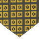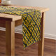 This table runner features a geometric abstract pattern of paw prints in gold, yellow, brown and black diamond squares.