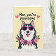 This card features a stylized dog with dark-and-light fur patches, sitting low and centered with an open-mouthed grin that feels like it’s aimed right at someone it adores ❤️. Bright pink sunglasses sit across its face, giving it a friendly, cheeky look, and a pink tongue peeks out as if it’s happily panting. Around its neck is a flower garland made of soft pink and deeper purple blooms with dark green leaves, like a sweet little gift worn close. The background is a pale yellow wash that keeps everything sunny and gentle, like a warm room in the morning. Near the top, the message “Mom you’re pawesome” appears in dark lettering, reading clearly against the light backdrop. Two small pink hearts sit near the text, adding a tender, affectionate touch without crowding the design 🌼. The shapes are crisp with light shadowing that makes the dog and flowers look slightly layered, almost like cut paper. The dog’s pink sunglasses have simple, rounded frames with solid lenses that stand out against the pale yellow background.