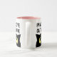 Pawsitive Cattitude funny cat cartoon coffee mug for pet owners. Cute white cup with kitty cartoon and humorous quote. Fun gift idea for animal lover, cat owner, cat person, cat dad, pet lover etc. Pink or custom color on the inside. Funny cat silhouette with big yellow eyes.
