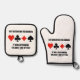 Showcase your wry duplicate bridge attitude with this oven mitt and pot holder set featuring the four card suits along with the following sound advice: "Pay Attention To Bidding It Will Determine The Best Line Of Play". Memorable bridge advice oven mitt and pot holder set for any bridge player who bakes and cooks!