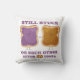 Peanut butter and jelly, best friends, 50th anniversary design with two slices of bread holding hands and cute Kawaii faces. One has grape jelly and one has peanut butter. Text says STILL STUCK ON EACH OTHER AFTER 50 YEARS. PinkInkArt.