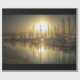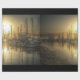 Shows sailboats docked in a harbor just after the sun has risen. The mirror-like surface of the water reflects each boat. HDR processing brings out exquisite detail in the entire scene.