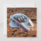 A futuristic, computer mouse-shaped spacecraft rests on the red, dusty surface of Mars. The mouse-like craft is white, streamlined, and resembles a miniature space shuttle. Small wings are positioned on its sides, red indicator lights shine beneath it, and on top, a transparent dome allows a clear view of the empty pilot seat – indicating that the crew has already disembarked.